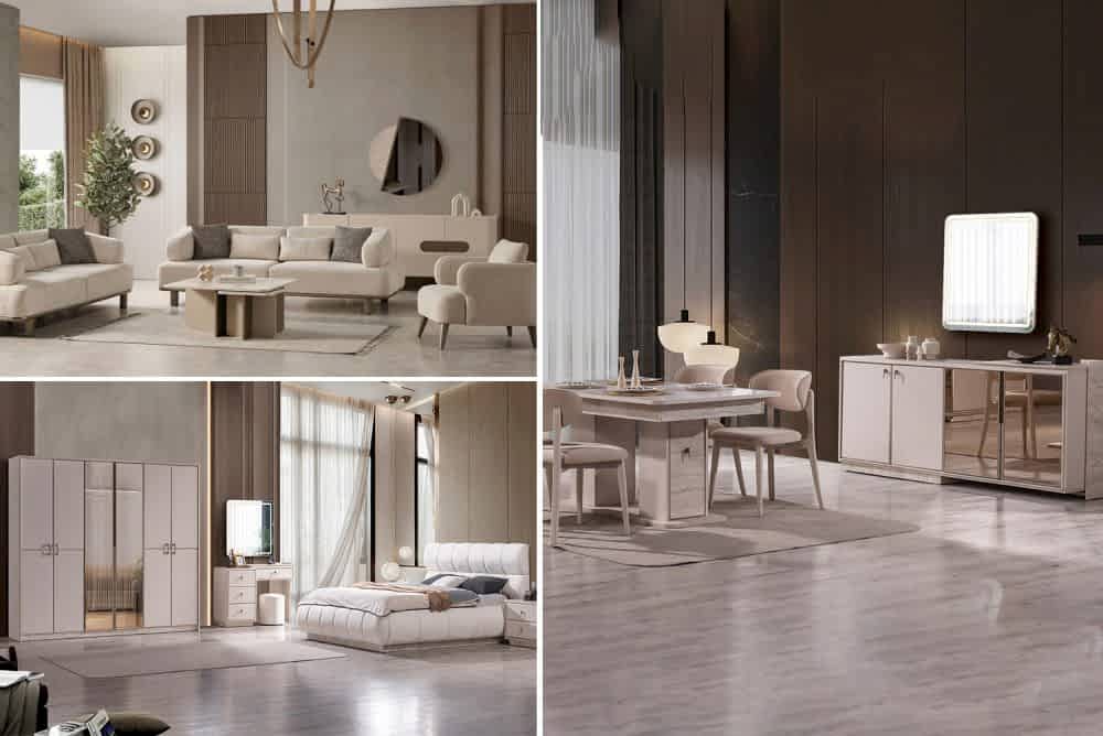 Petra Robe Düğün Paketi, yeni evlenen ve evini yenileyen çiftler için avantajlı içeriğiyle favori seçimlerinden biri haline geliyor. İnegöl Mobilya üretimi olan düğün paketi içeriği yatak odası takımı, yemek odası takımı ve koltuk takımından oluşmaktadır.